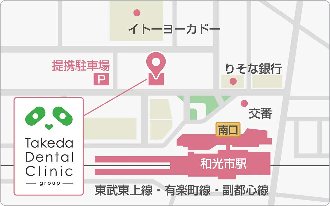 「和光市駅」南口から徒歩1分、お車でお越しの場合は提携駐車場もご利用いただけます。お気軽にご来院ください。